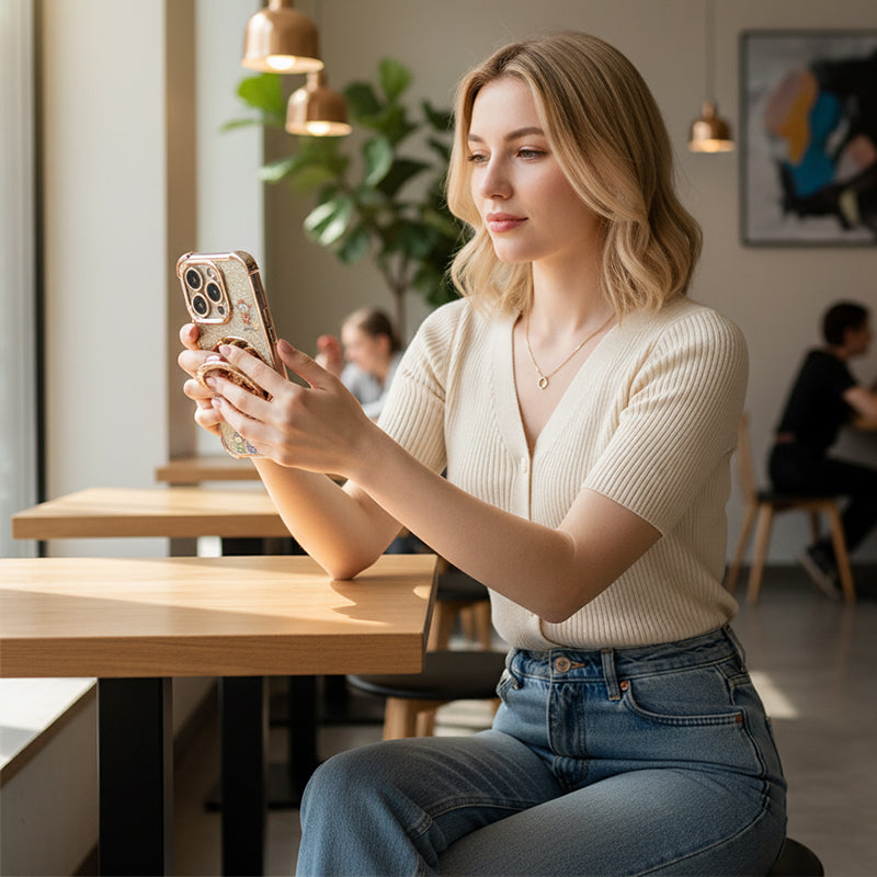 SOPORTE DE ANILLO GIRATORIO: Disfruta de una visualización versátil con manos libres tanto en modo vertical como horizontal. Este anillo giratorio de 360 grados integrado también proporciona un agarre seguro, lo que reduce significativamente el riesgo de caídas accidentales durante el uso diario.